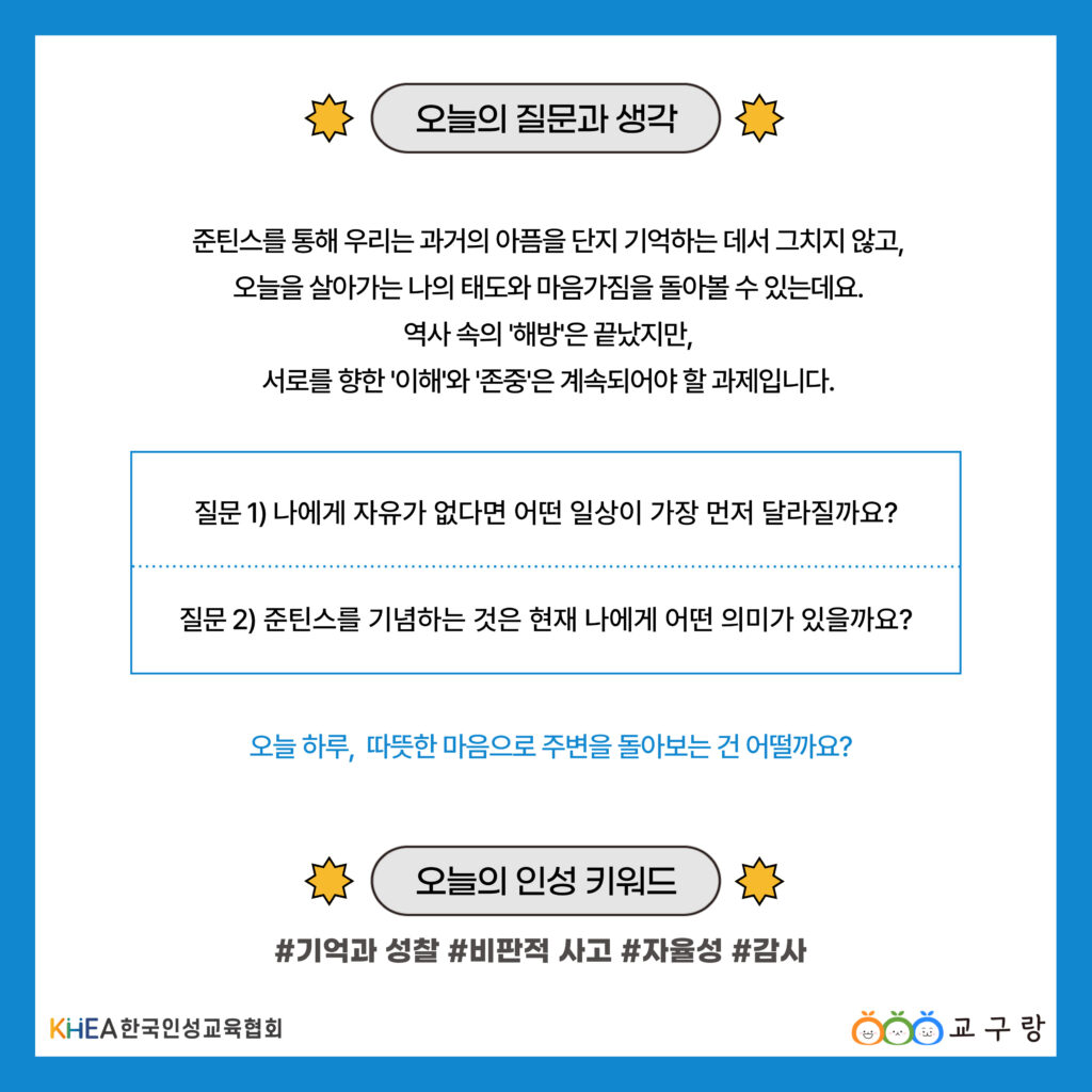 역사 속 ‘해방’은 끝이 났지만, 준틴스는 오늘날 우리에게 ‘자유의 의미’를 되새기고, 타인을 향한 ‘이해’와 ‘존중’을